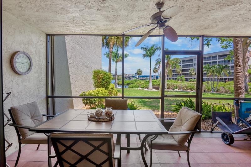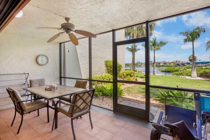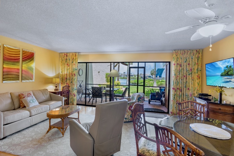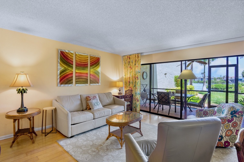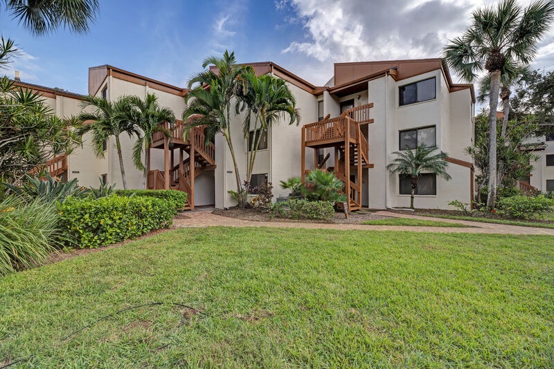 This lushly landscaped property spans 14 acres, providing a peaceful retreat with the beach community's amenities at your fingertips. The attractively decorated 2-bedroom, 2-bathroom condo on the first floor boasts an inviting ambiance with a large screened lanai that overlooks the picturesque Intracoastal Waterway, making it perfect for relaxation.