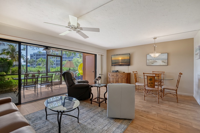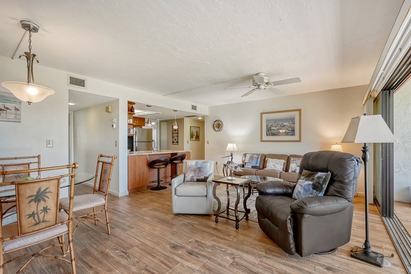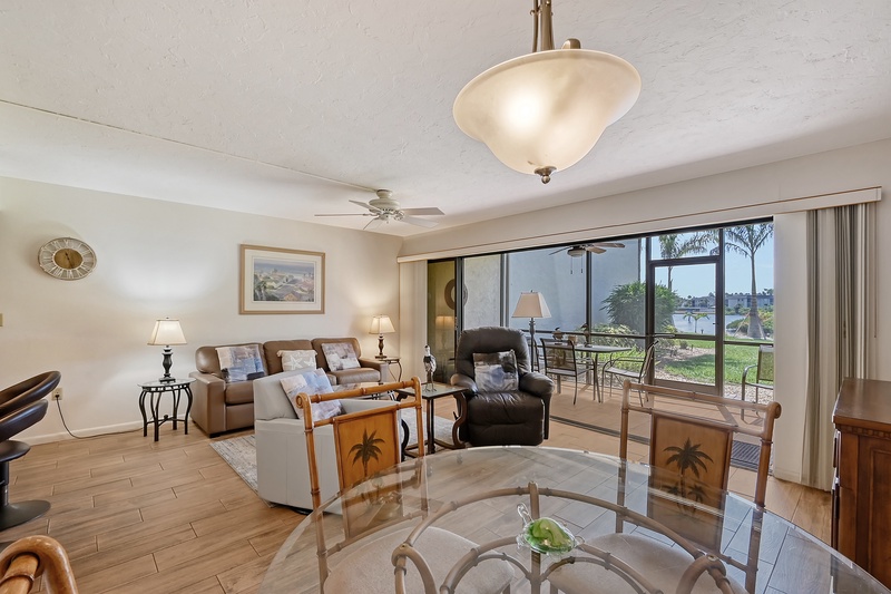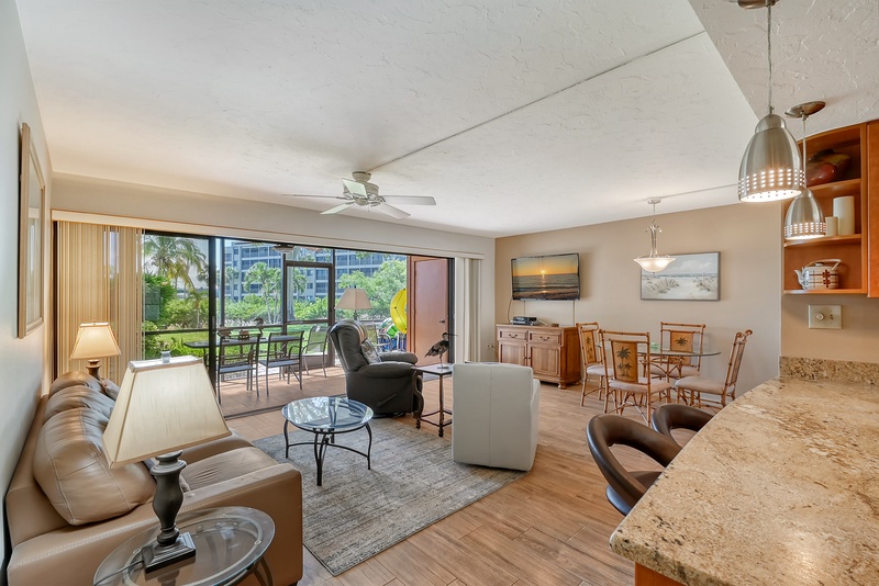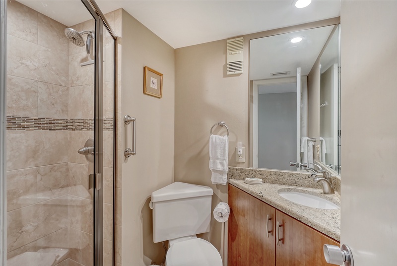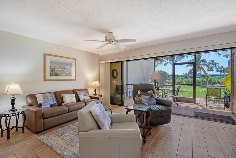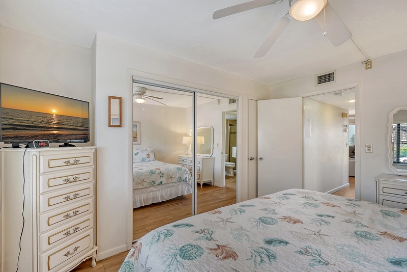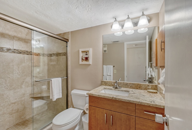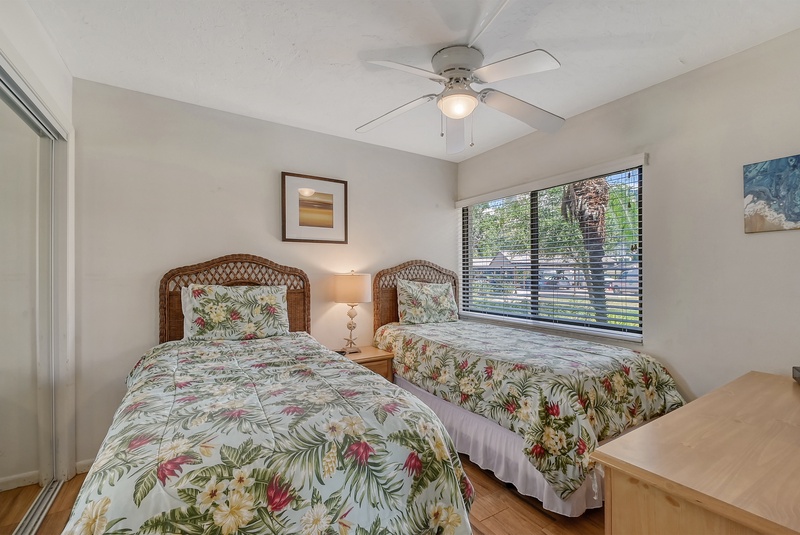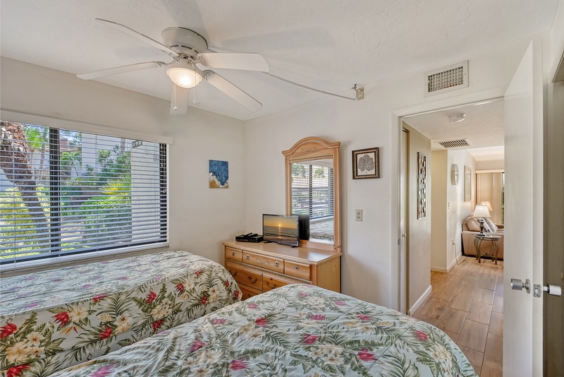 The spacious interior of Midnight Cove II 117F is thoughtfully designed for your comfort. The primary bedroom features a king bed and tropical decor along with an ensuite bathroom that includes a walk-in shower for your convenience. The guest bedroom is equipped with twin beds, ideal for accommodating family or friends. Guests will also find that the common area includes a queen sleeper sofa in the living room, providing additional flexibility for sleeping arrangements. All bathrooms feature modern walk-in shower facilities, ensuring a refreshing experience after a day in the sun.