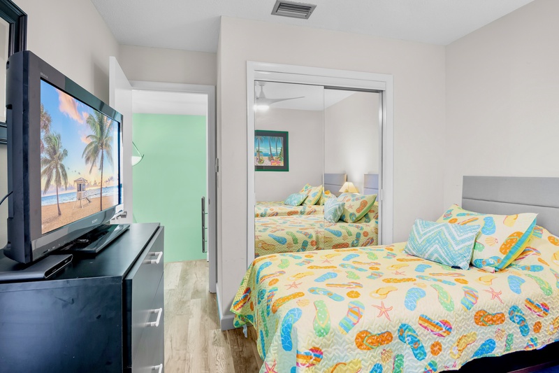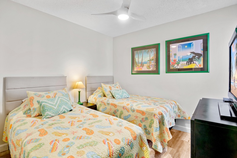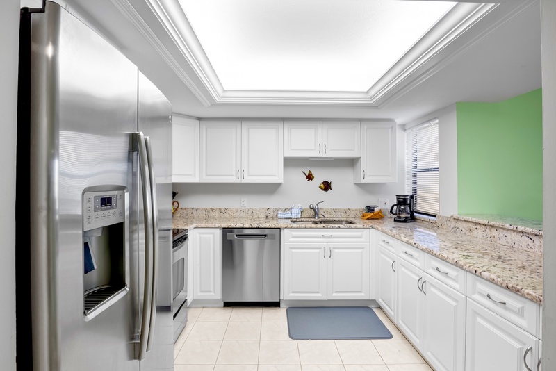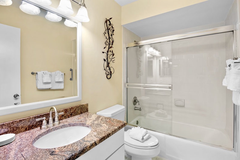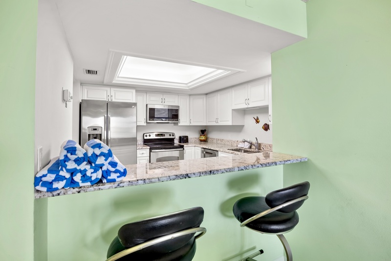 Inside, Midnight Cove II Unit 220D offers a beautifully designed living space perfect for relaxation and togetherness. The inviting living room features plush seating and a large flat-screen TV, creating an ideal gathering spot after a day on the beach. The fully equipped kitchen boasts modern appliances, stunning granite countertops, and all the necessary cookware and utensils for family dining. The adjacent dining area comfortably seats six, making it easy to share meals and create lasting memories. The primary bedroom features a luxurious king bed, a spacious walk-in closet, and an ensuite bathroom complete with an updated walk-in shower. The second bedroom offers a cozy queen bed, while the third bedroom is perfect for kids with twin beds. A shared bathroom with a combo tub/shower provides added convenience for all guests.