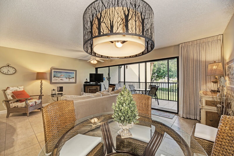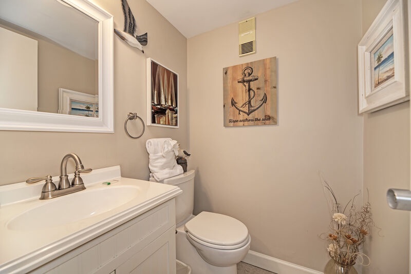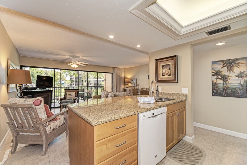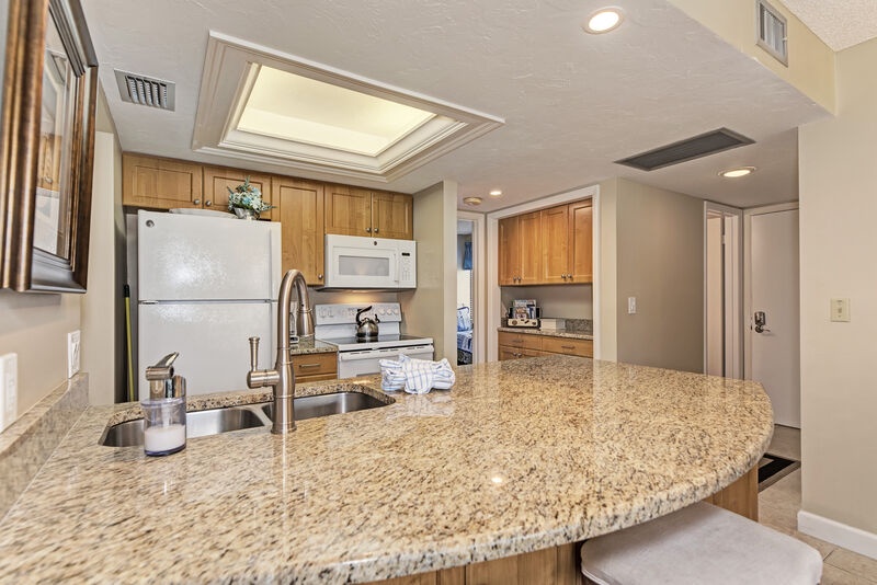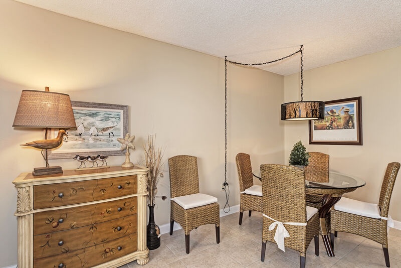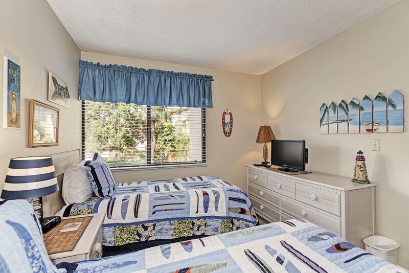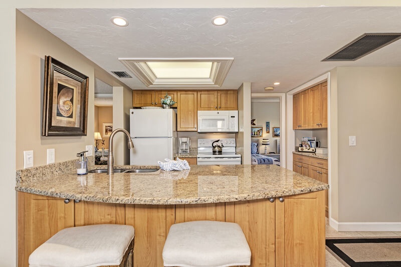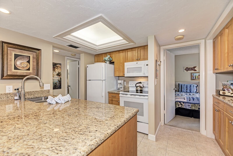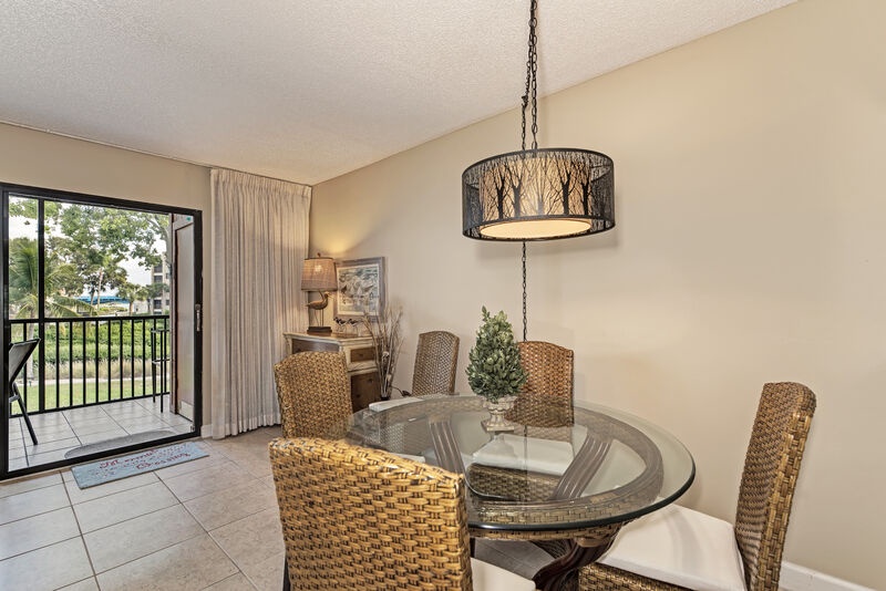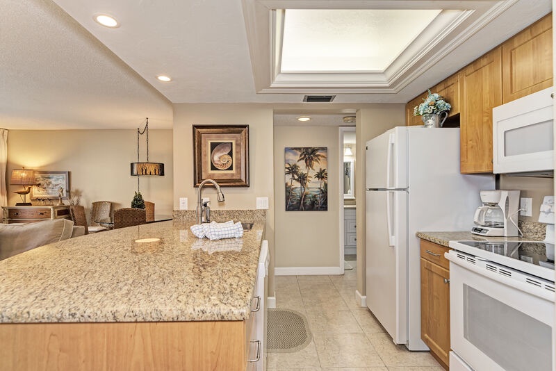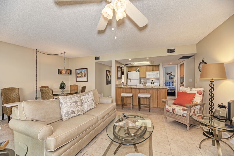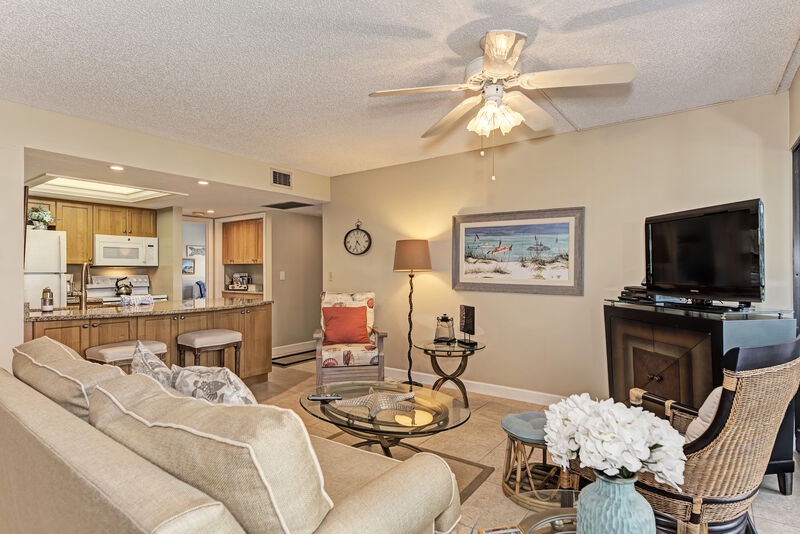 Inside, this cozy second-floor unit features a newly renovated kitchen equipped with modern appliances and ample counter space, making meal preparation a delight. The open living space is decorated in coastal decor and includes comfortable furnishings, a welcoming atmosphere, and a dining area that seats four.