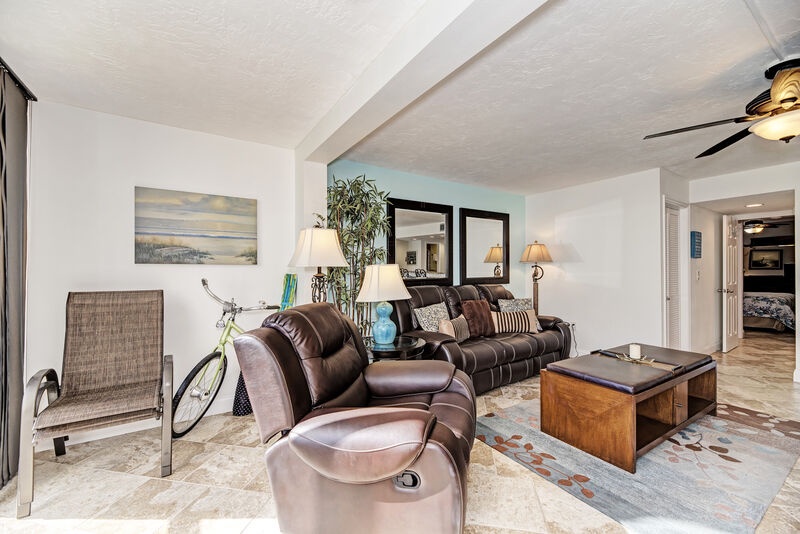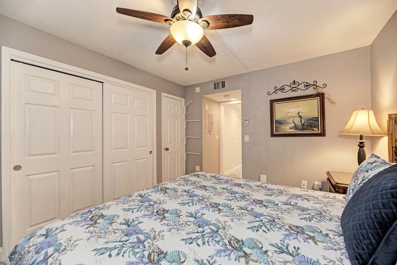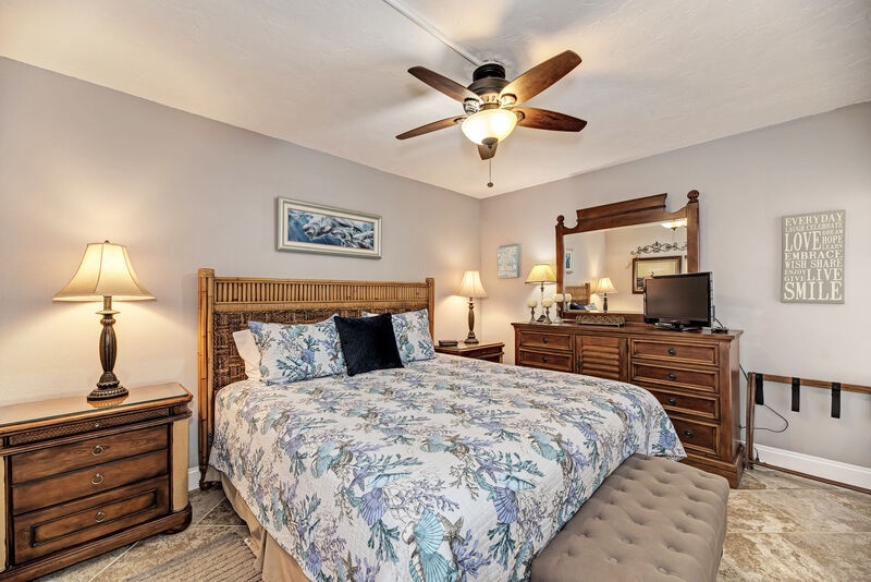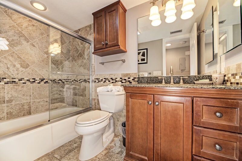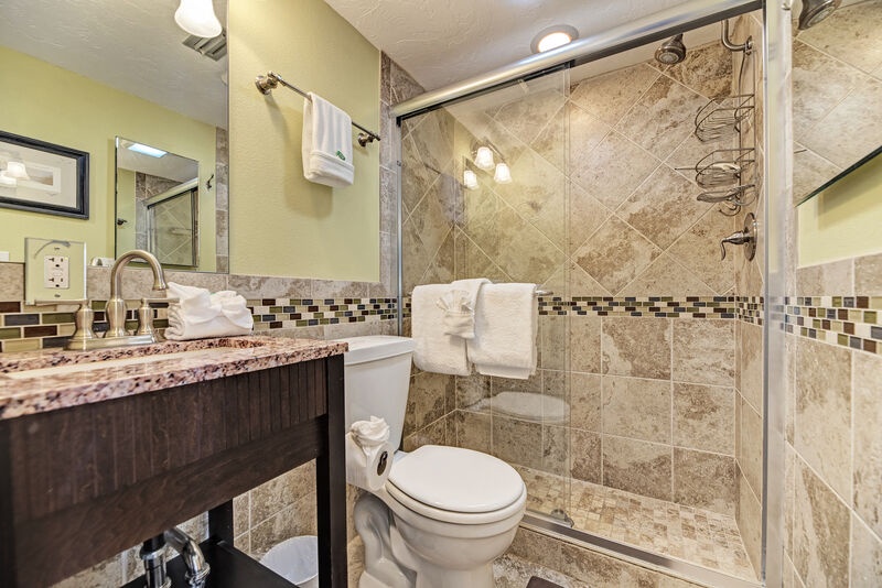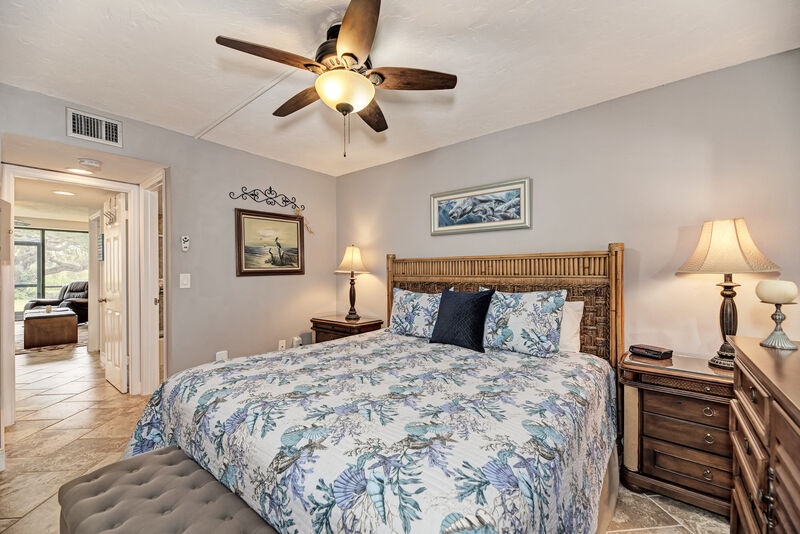 The primary bedroom features a luxurious king bed and an ensuite bathroom with a convenient shower-tub combo. The second bedroom offers two twin beds, with easy access to a hall bathroom equipped with a walk-in shower.