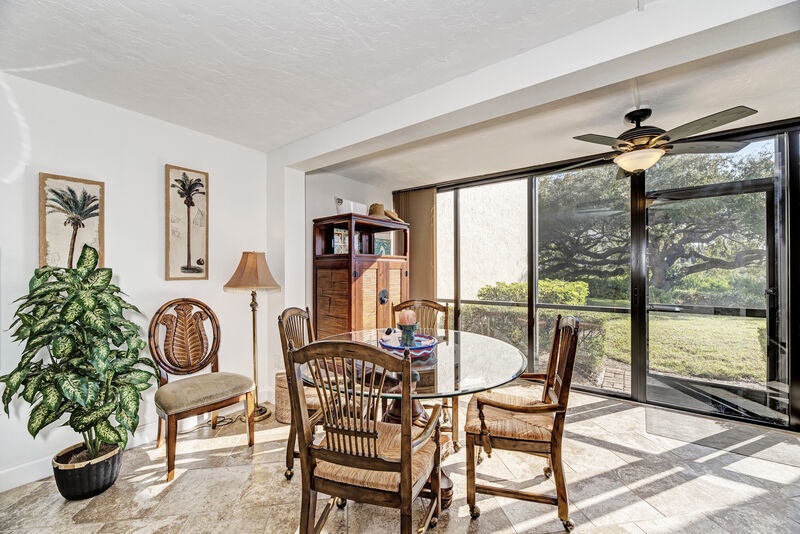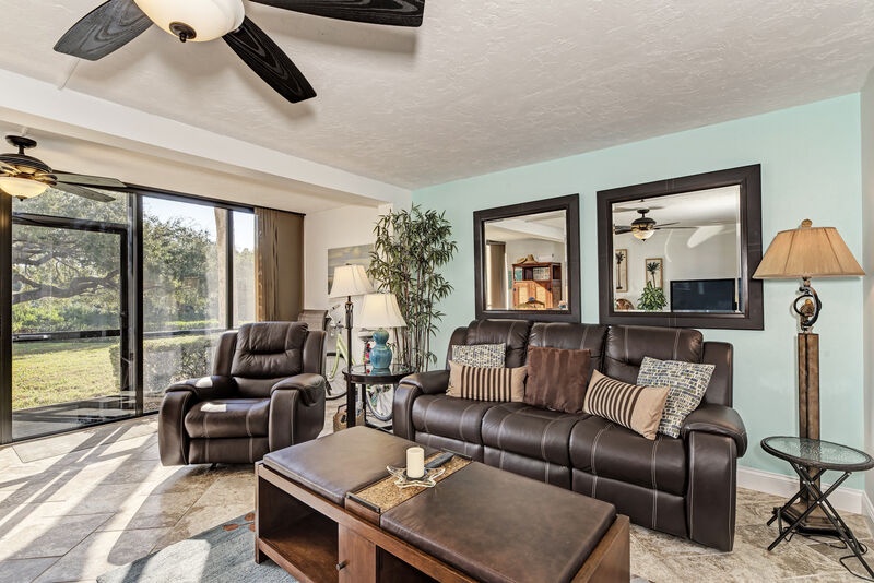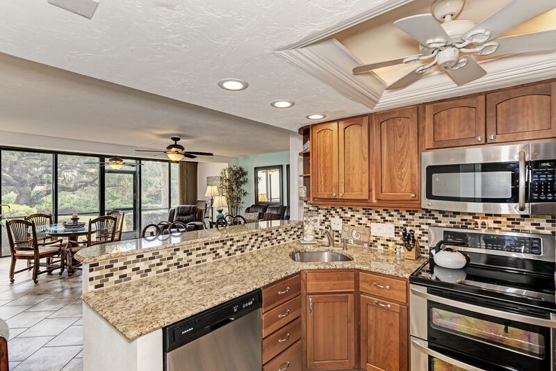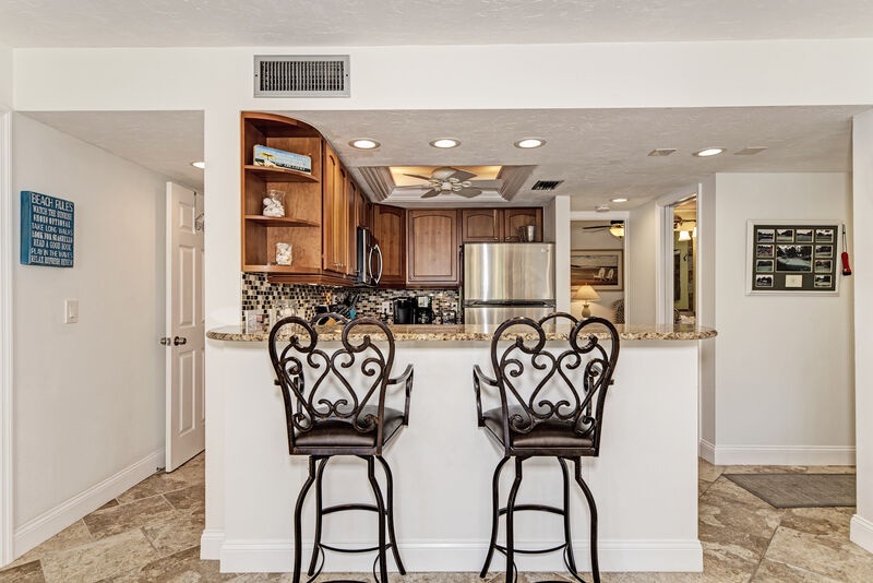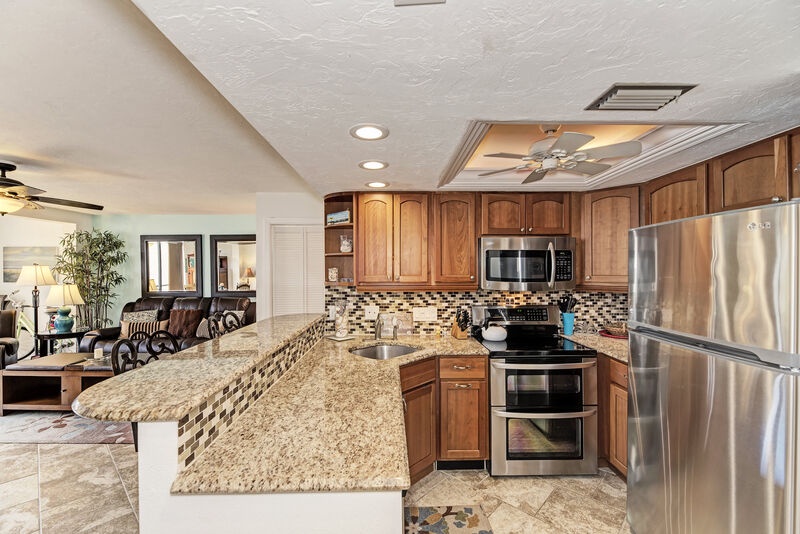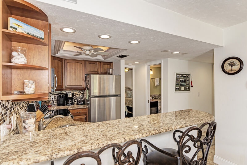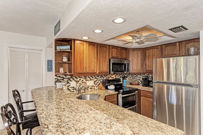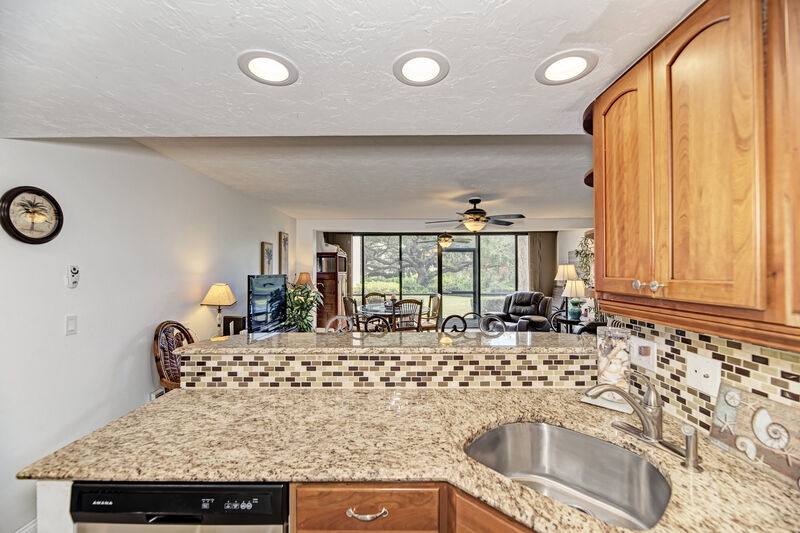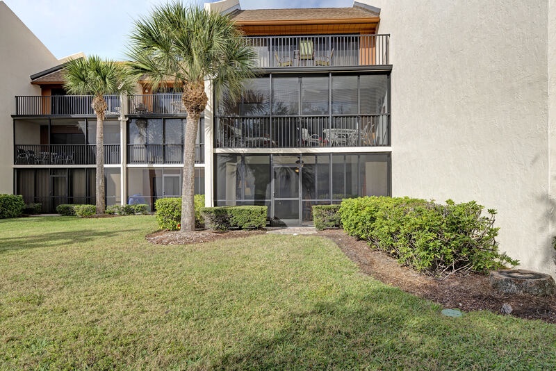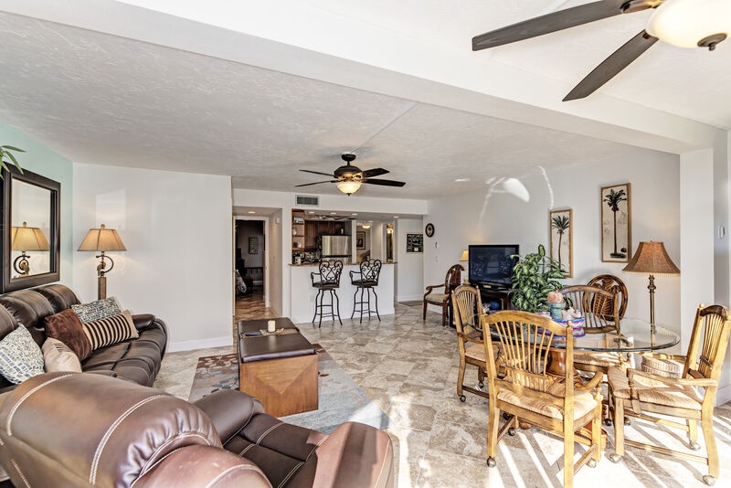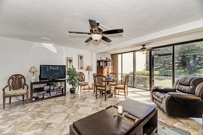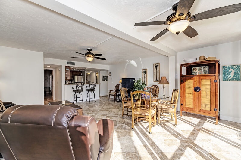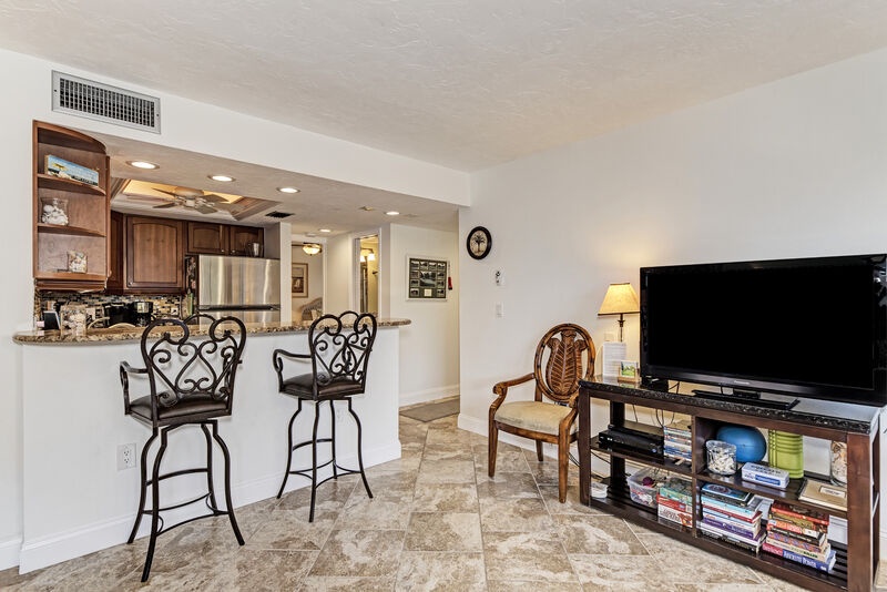 Welcome to Midnight Cove II 411F! Discover the charm of this tastefully renovated 1st-floor condominium, featuring 2 bedrooms and 2 baths, ideal for families or friends seeking a relaxing retreat. Enjoy a lovely view of the canal and lush tropical landscaping from the comfort of your home away from home. This ground-level unit boasts an open living space that seamlessly integrates a cozy TV area, a dining area, and a fully equipped kitchen with modern stainless steel appliances.