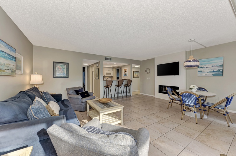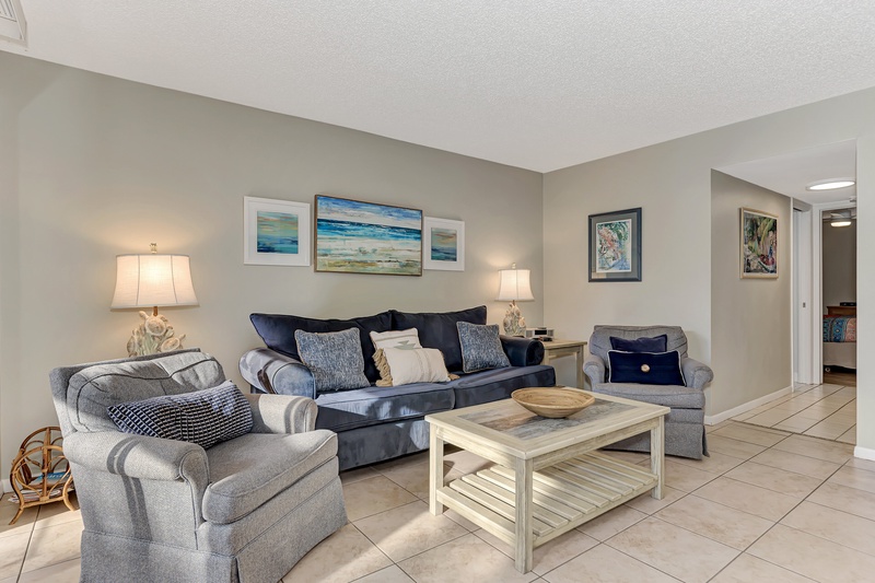 Welcome to Midnight Cove II 412F! Step into this charming 1st-floor condominium, featuring an inviting living room boasts two stylish chairs and updated wall decor, creating a cozy atmosphere for relaxation. This home away from home is equipped with all the essentials, including linens, cooking utensils, dishware, and small appliances, ensuring your stay is comfortable and convenient.