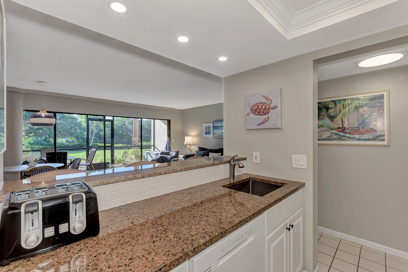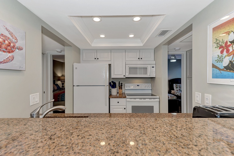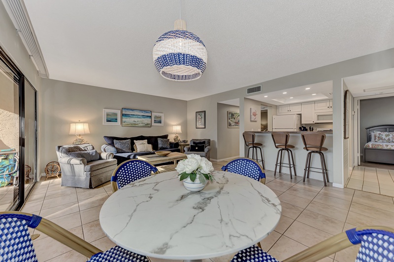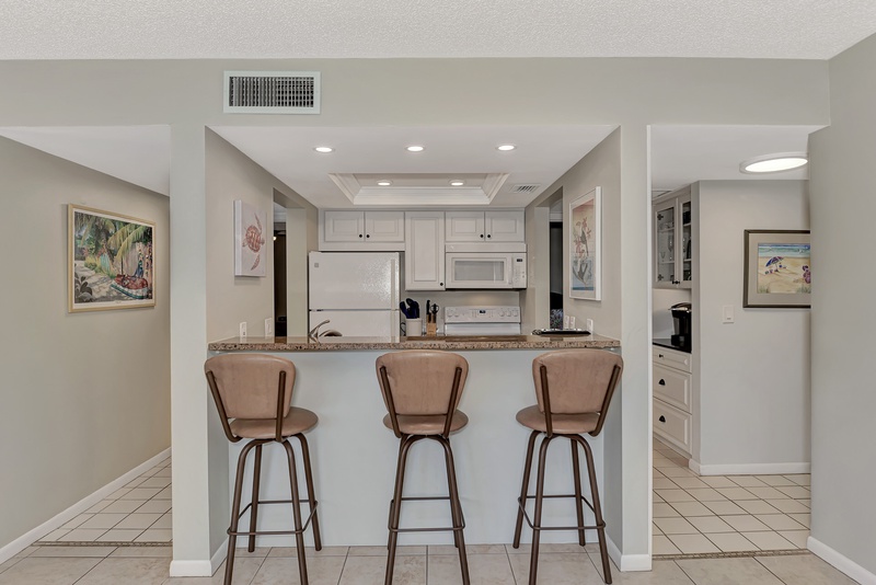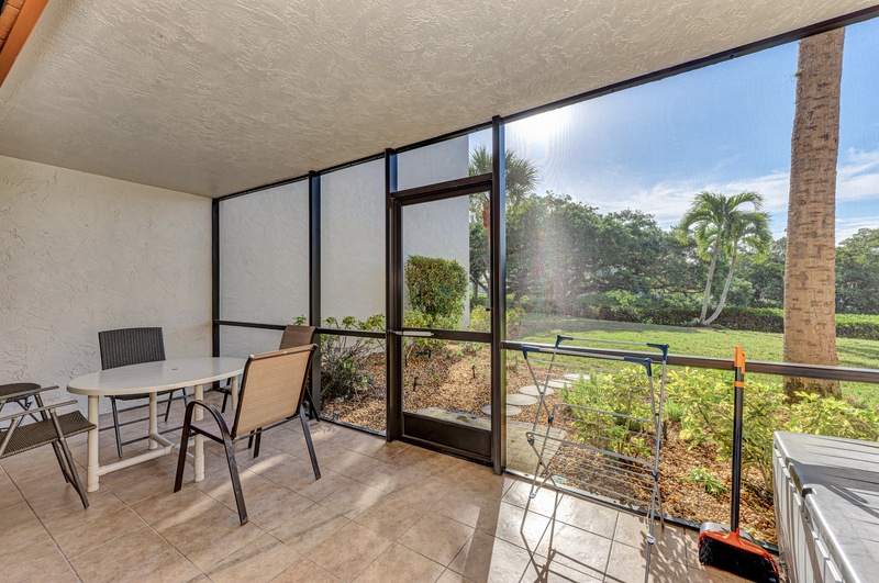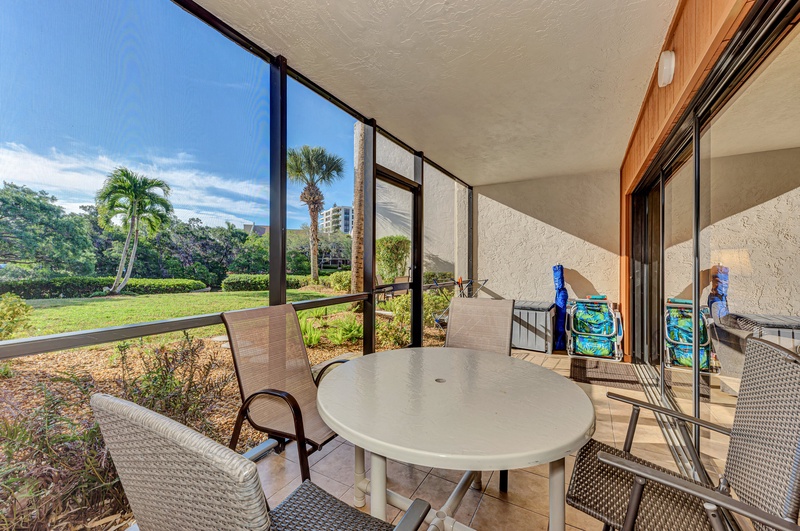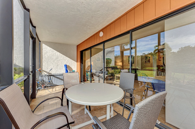 With a king-size bed in the master bedroom and two twin beds in the second bedroom, this unit accommodates up to four guests. The fully equipped kitchen includes all appliances, a microwave, dishwasher, toaster, and coffee maker, making meal prep a breeze. A full bath with a tub/shower combination and a half bath off the guest bedroom provide ample facilities. Enjoy morning meals on the large screened lanai, taking in the beautiful grounds, along with the convenience of a washer and dryer for added ease.