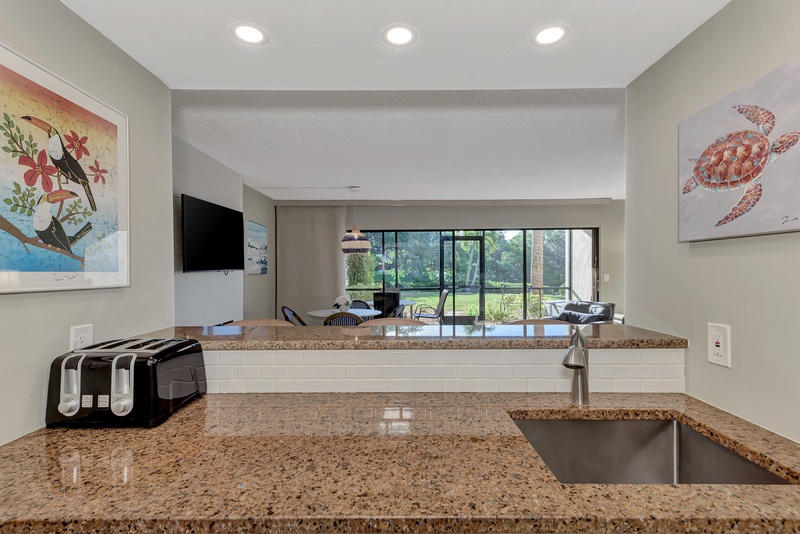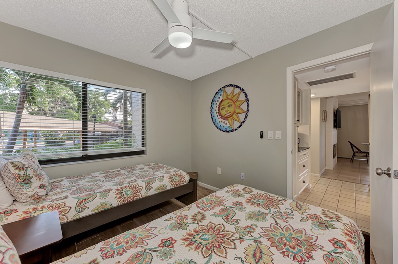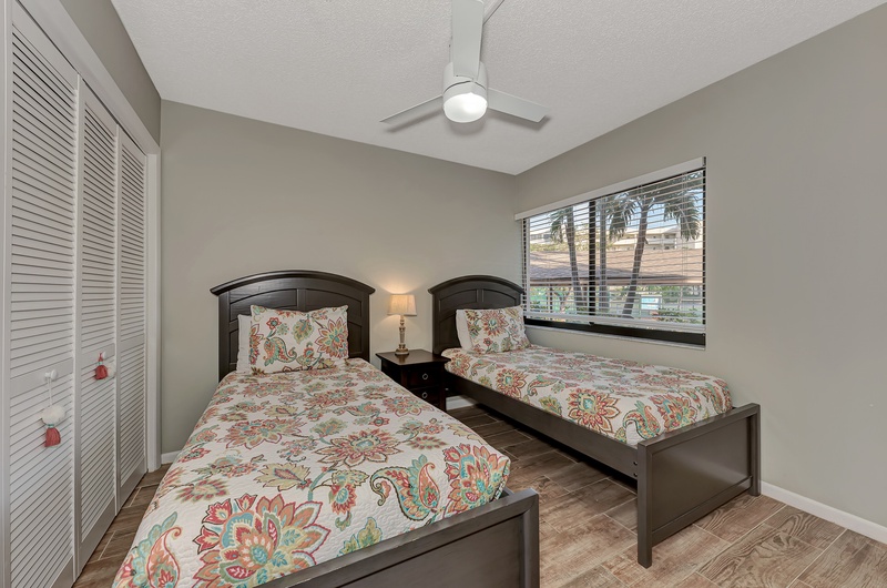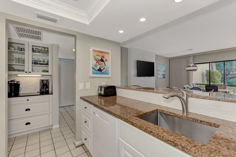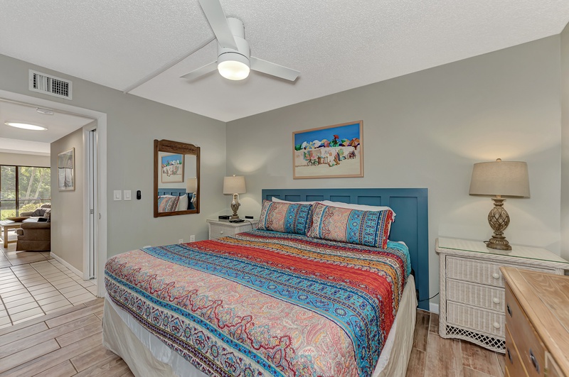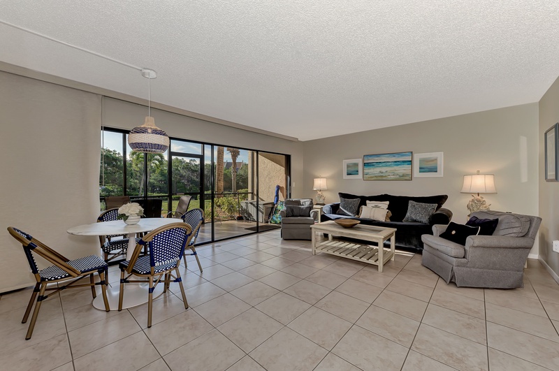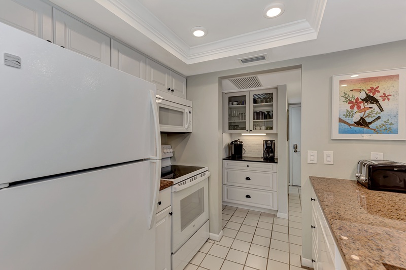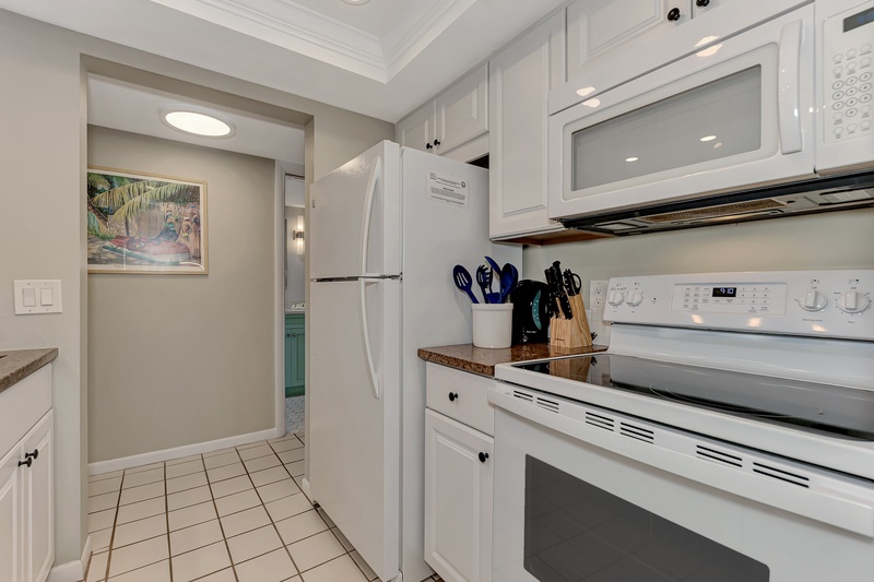 With a king-size bed in the master bedroom and two twin beds in the second bedroom, this unit accommodates up to four guests. The fully equipped kitchen includes all appliances, a microwave, dishwasher, toaster, and coffee maker, making meal prep a breeze. A full bath with a tub/shower combination and a half bath off the guest bedroom provide ample facilities. Enjoy morning meals on the large screened lanai, taking in the beautiful grounds, along with the convenience of a washer and dryer for added ease.