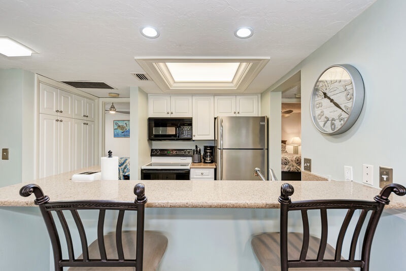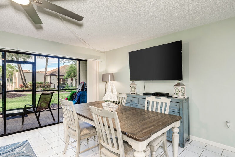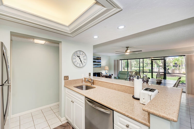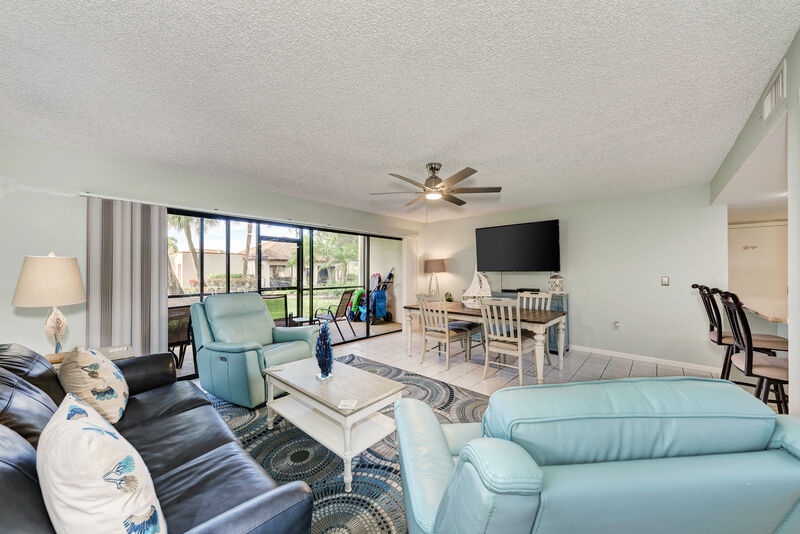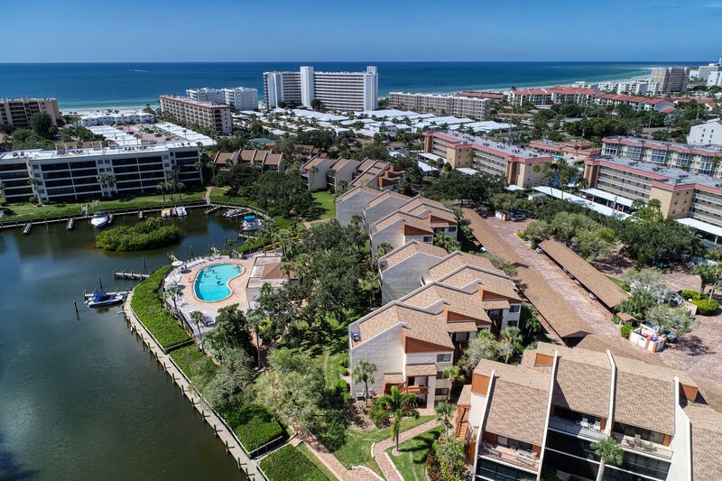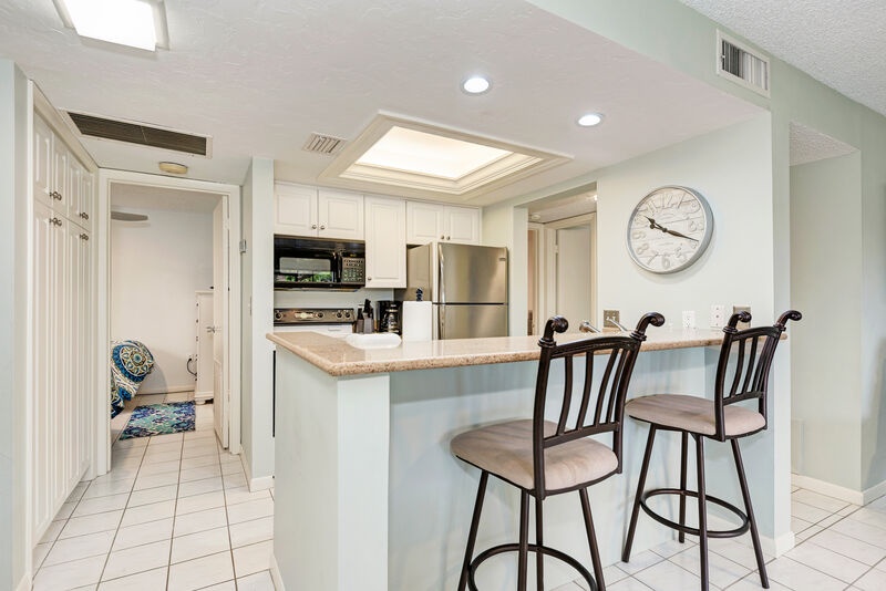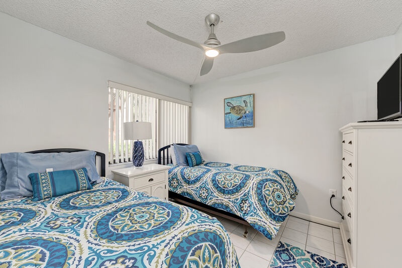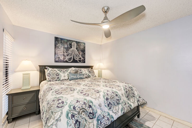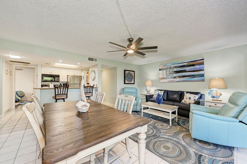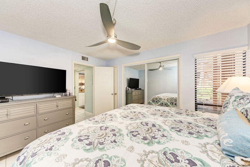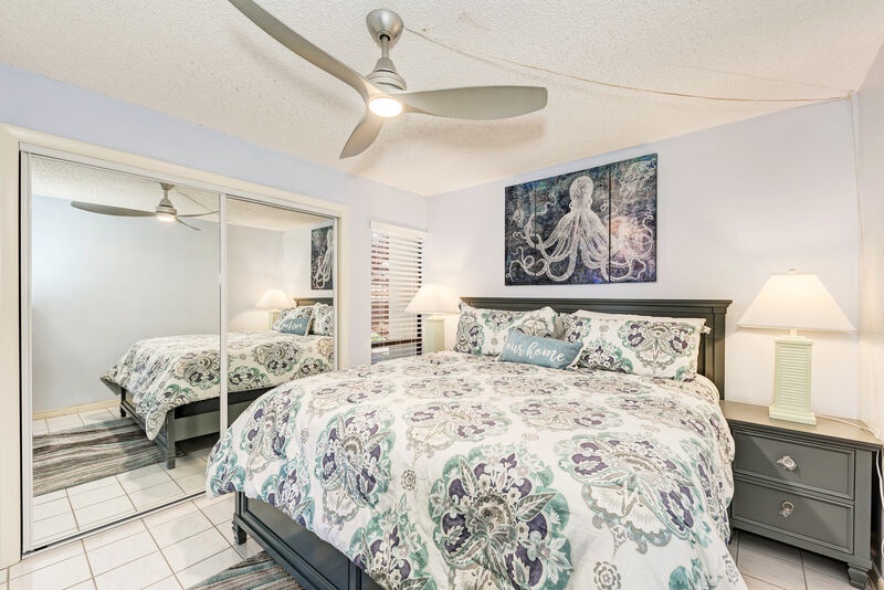 This fully-equipped ground floor end unit, centrally located, is only steps away from both the pool and the stunning Crescent Beach. Relax on the screened-in lanai with an outdoor dining table, and enjoy coastal decor throughout. The master bedroom features a king bed, while the guest bedroom offers two twin beds.