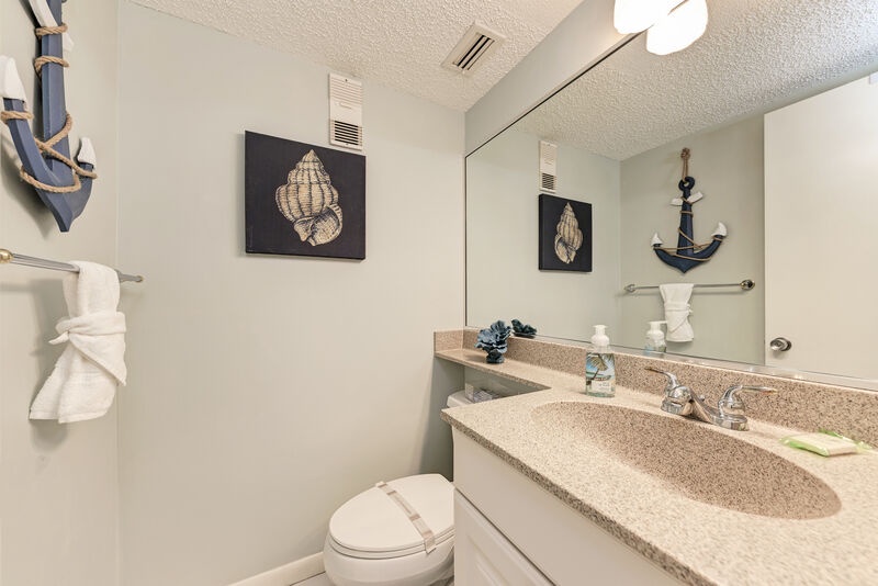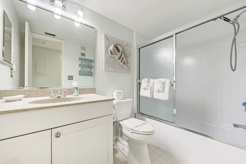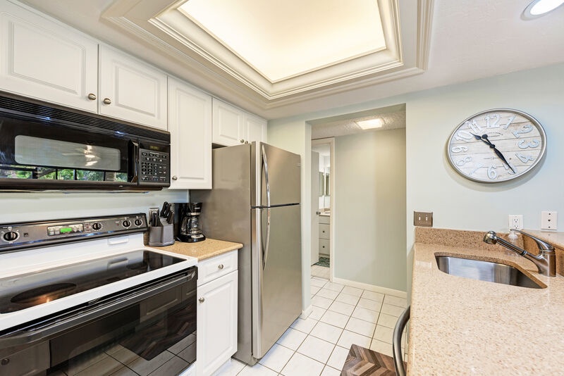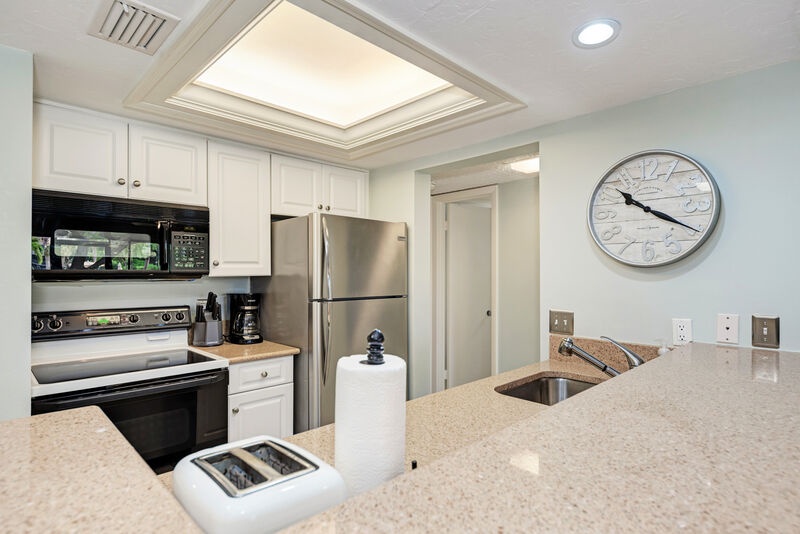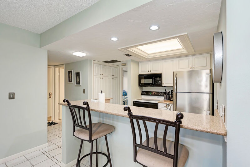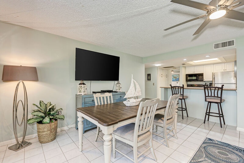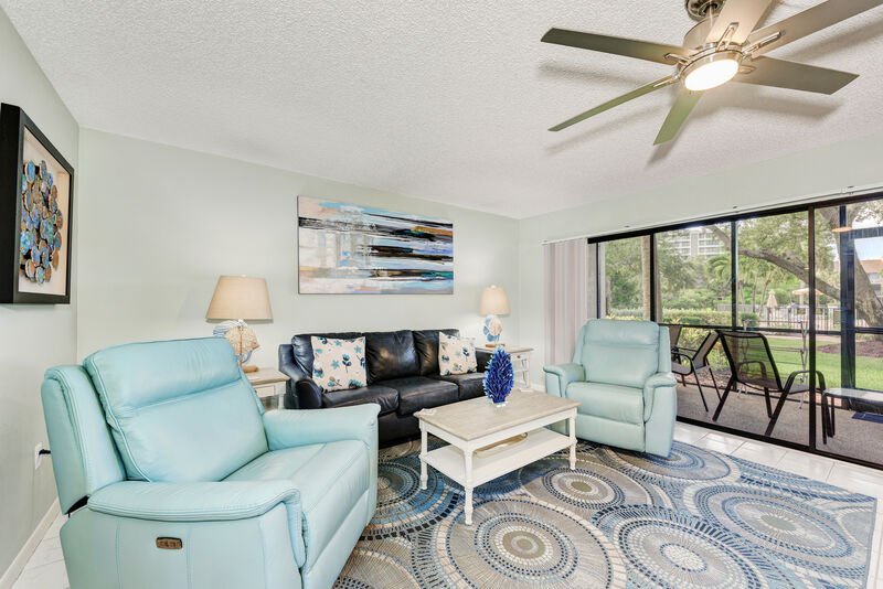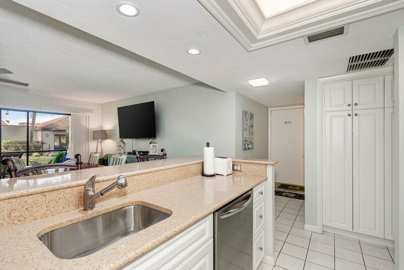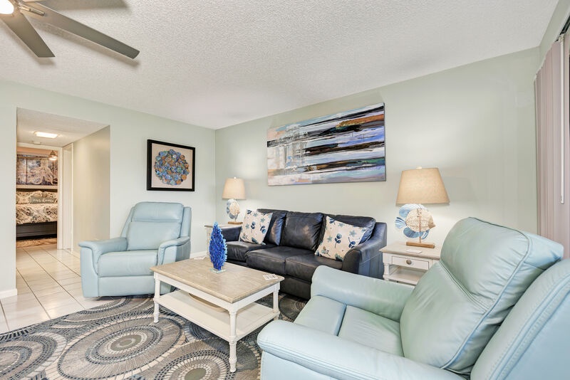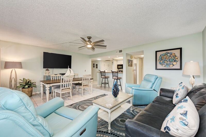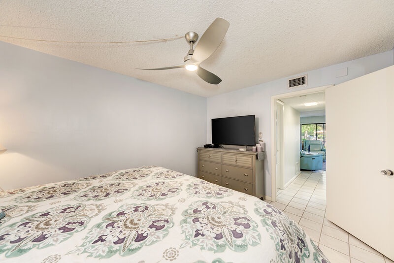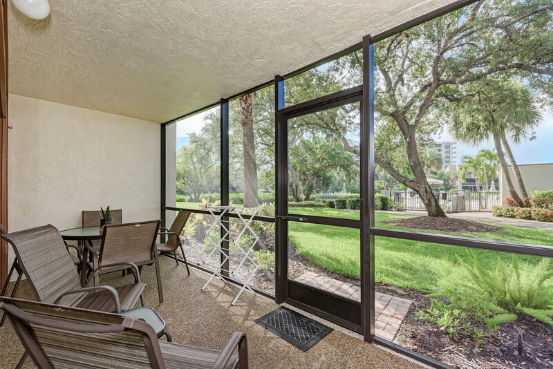 This fully-equipped ground floor end unit, centrally located, is only steps away from both the pool and the stunning Crescent Beach. Relax on the screened-in lanai with an outdoor dining table, and enjoy coastal decor throughout. The master bedroom features a king bed, while the guest bedroom offers two twin beds.