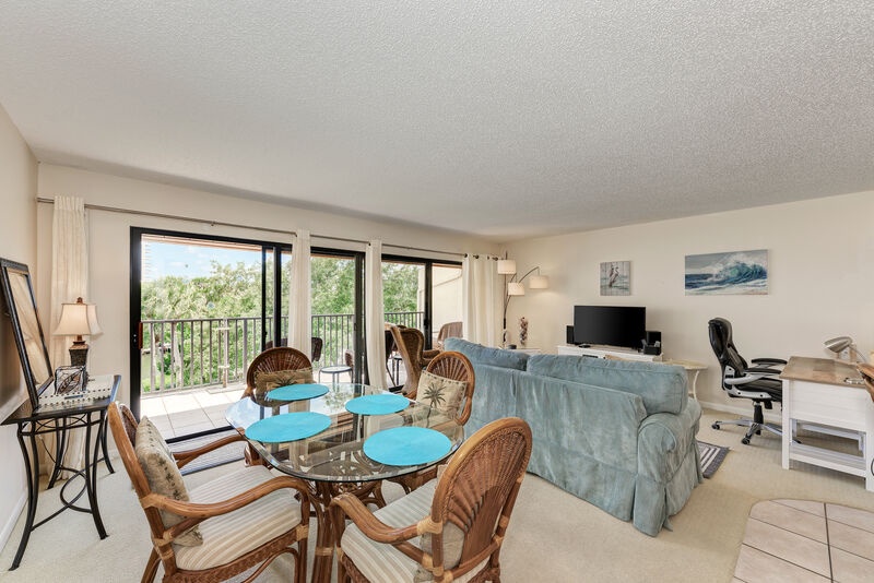 Inside, the bright and airy living space includes a comfortable seating area and a dining space that opens to a beautiful open balcony, offering picturesque views of the Intracoastal Waterway—perfect for watching boats pass by. The fully equipped kitchen provides everything you need to prepare meals, making it easy to enjoy dining at home.