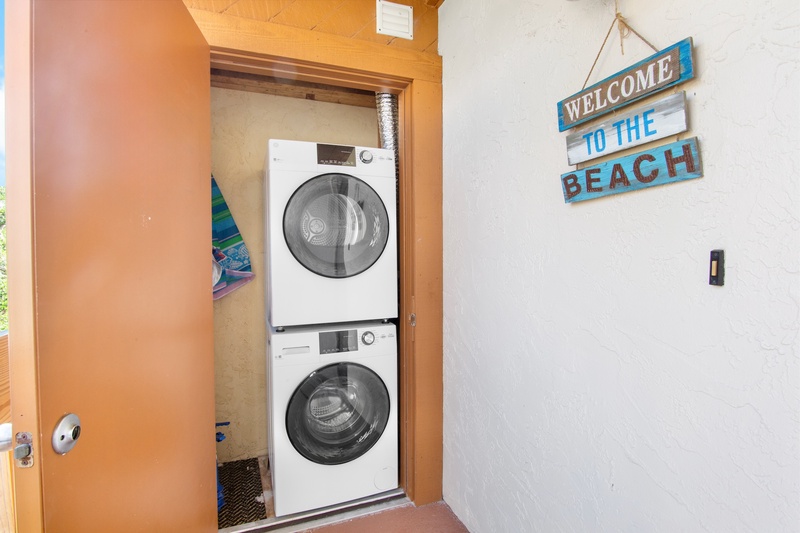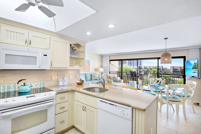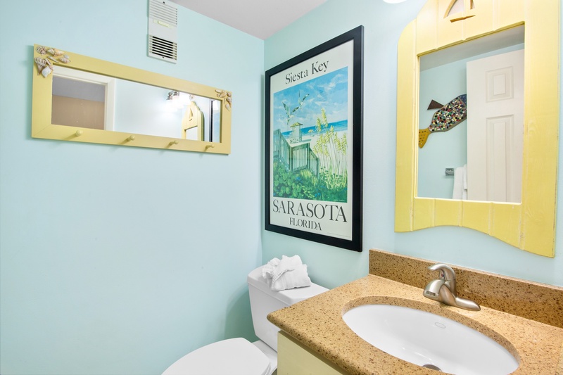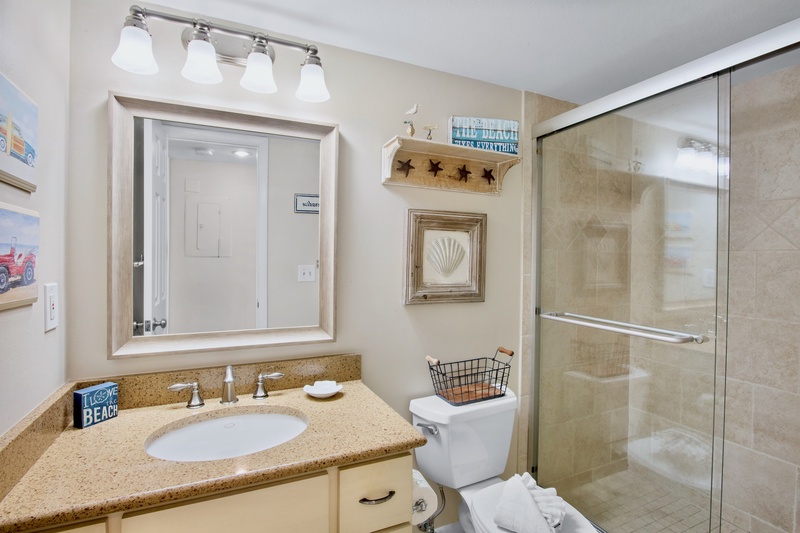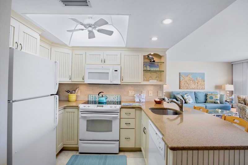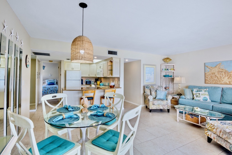 This bright and airy 2-bedroom, 1.5-bath condo features an open kitchen concept with custom cabinetry and quartz countertops, making it a perfect space for preparing meals. The primary bedroom boasts a king-size bed, and the guest bedroom offers two twin beds, comfortably accommodating up to four guests. For added convenience, a washer and dryer are available for extended stays.
