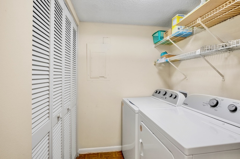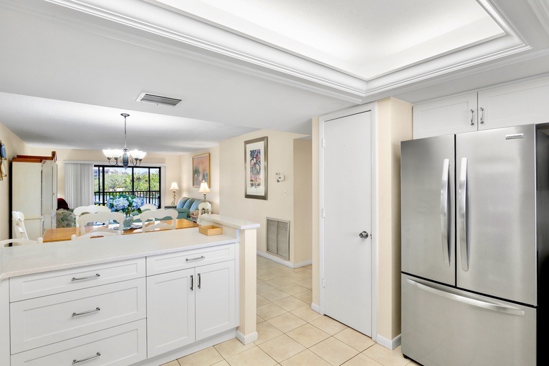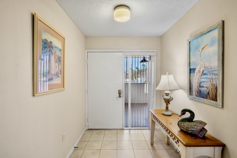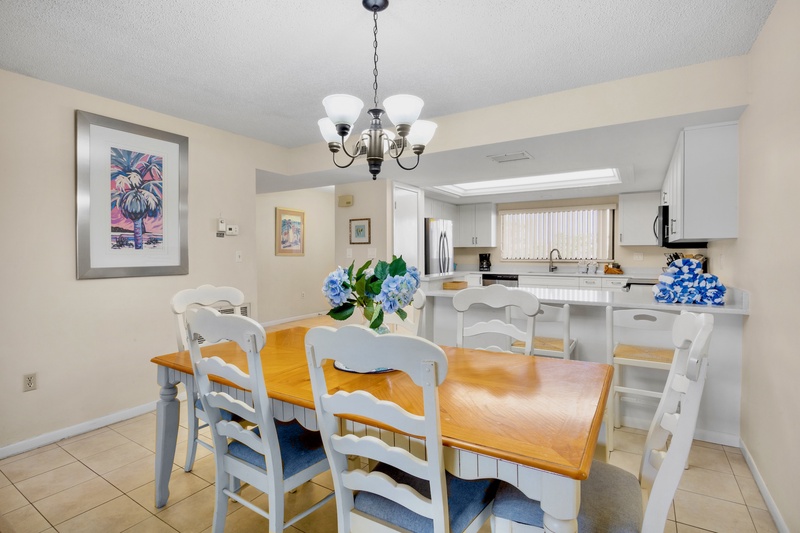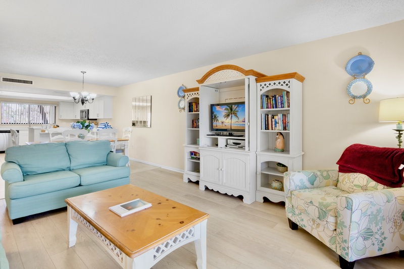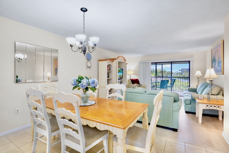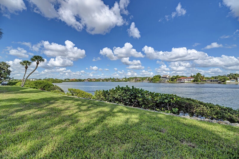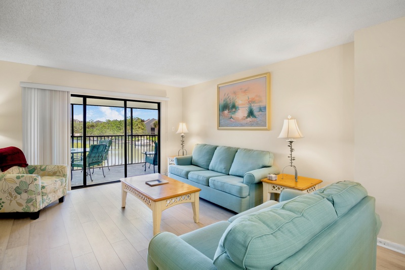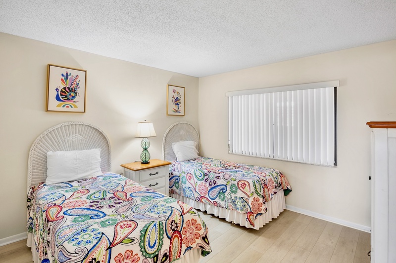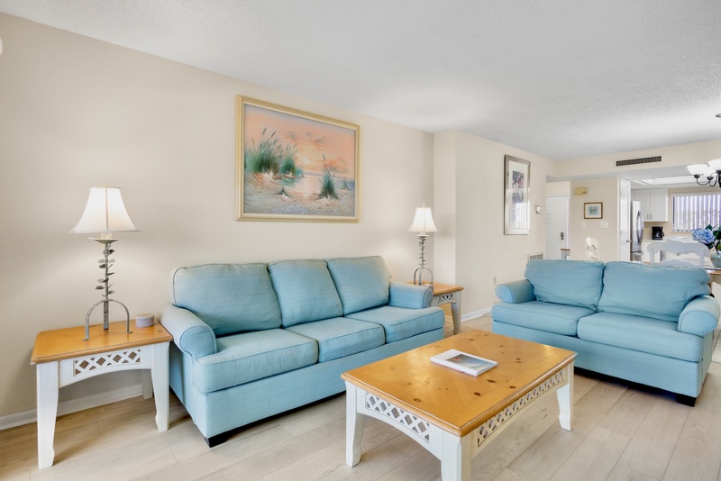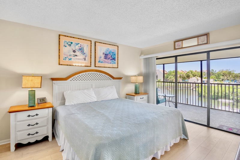 This beautifully decorated two-bedroom, two-bathroom condo boasts picturesque views of the lagoon, lush grounds, and the Intracoastal Waterway. The primary bedroom features a king bed, while the guest bedroom offers two twin beds, making it perfect for families. The living room includes a sleeper sofa for extra guests, accommodating up to six people comfortably. You'll also appreciate the convenience of an in-unit washer and dryer, enhancing your stay.