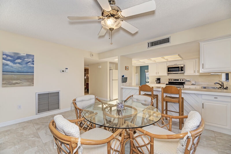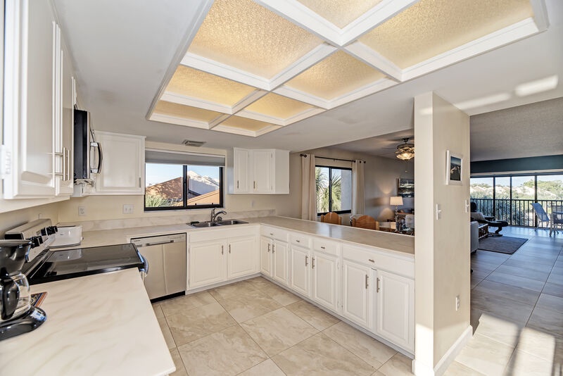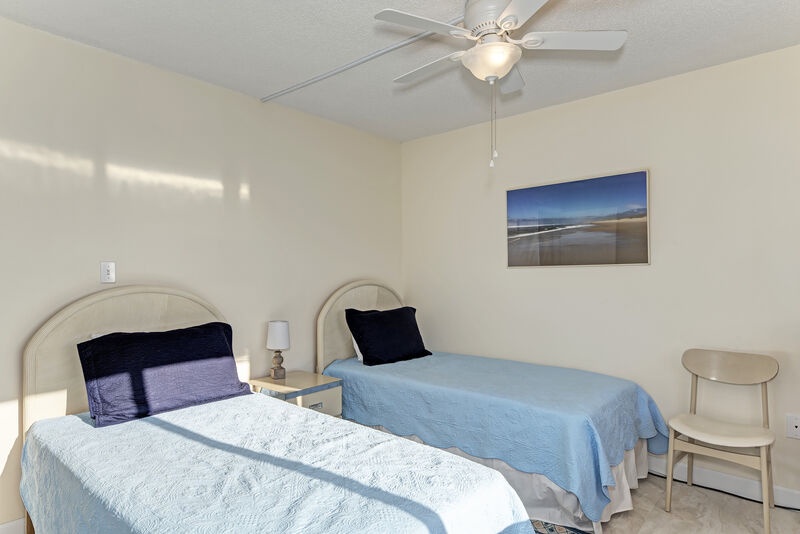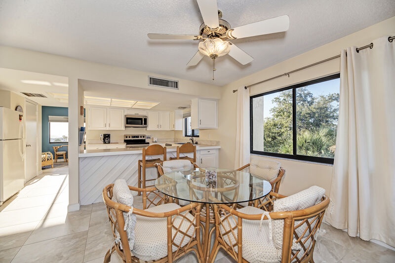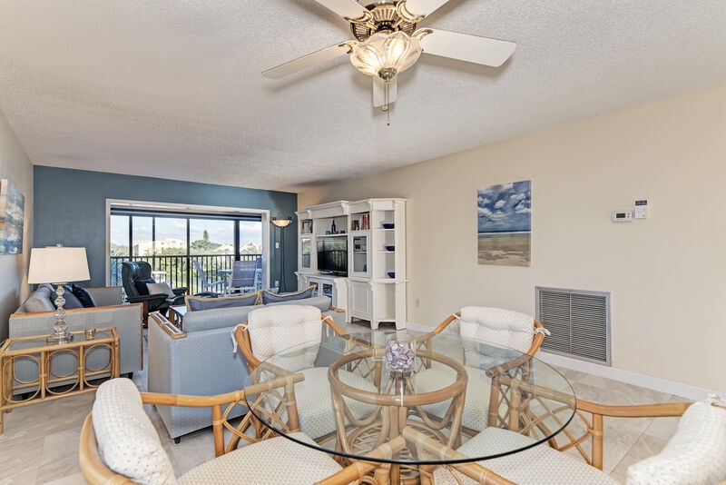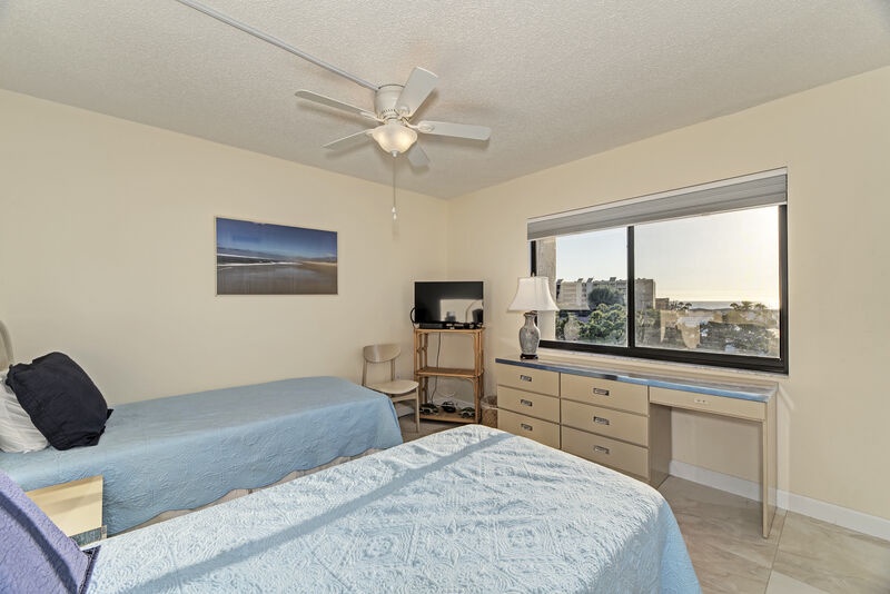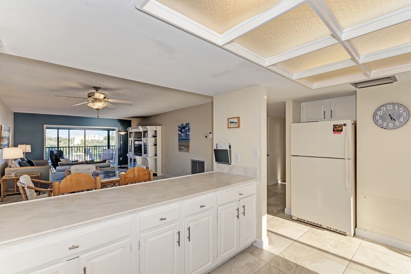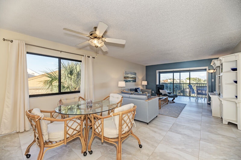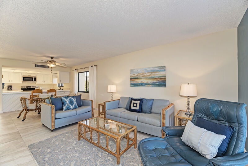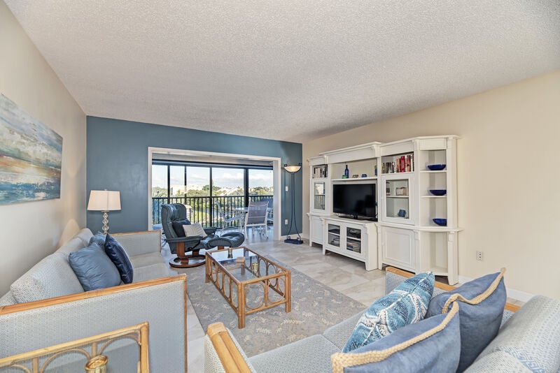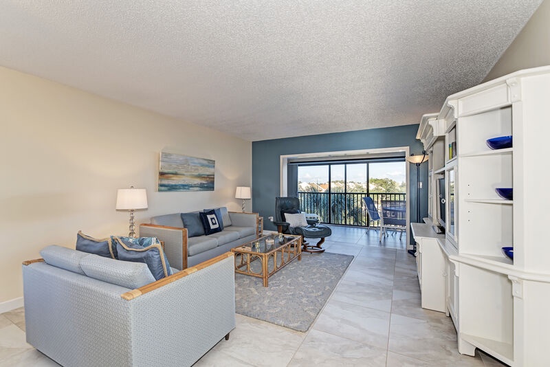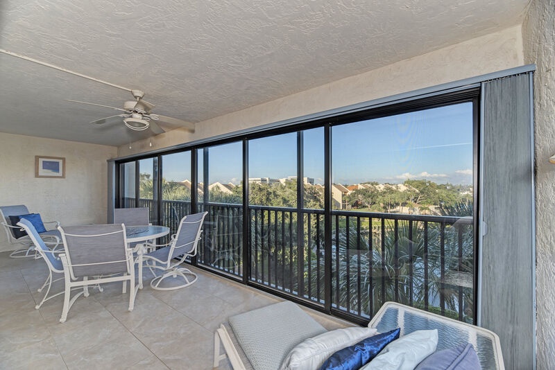 This luminous and highly desirable end unit on the 4th floor offers easy elevator access and has two bedrooms, one with a queen bed and a second with two twin beds. You’ll be captivated by the peaceful panoramic views of the lagoon, grounds, and marina from the screened lanai—perfect for sipping your morning coffee. Additional views of the Gulf can be enjoyed from the guest bedroom and breakfast room. For boating enthusiasts, a 30-ft finger slip right in front of the condo is also included for your convenience.