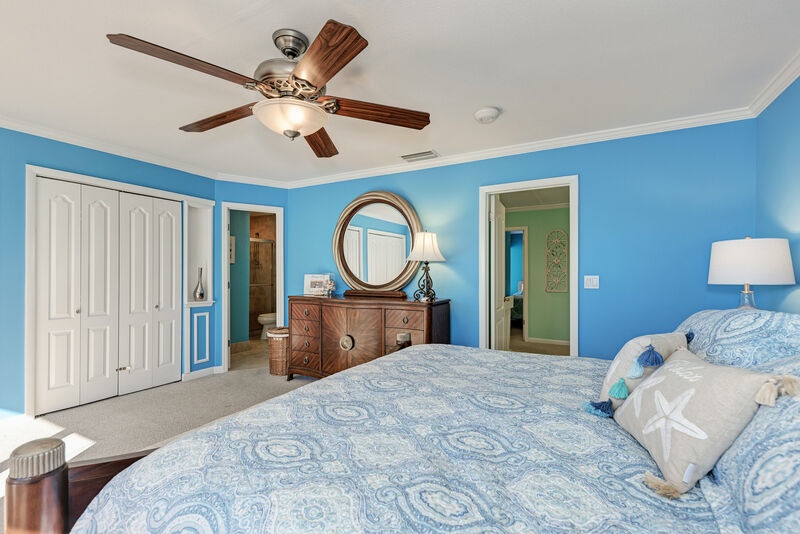 Upstairs, the primary bedroom features a luxurious king bed, a private balcony, and an ensuite bathroom with a walk-in shower. The second bedroom includes a comfortable queen bed, while the whimsical third bedroom is perfect for kids, furnished with two twin beds. These rooms share a convenient hall bath with a shower-tub combo.