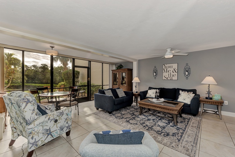 Welcome to Midnight Cove II Unit 413! Experience the tranquility of our beautiful, quiet, and comfortable 2-bedroom ground floor condo, nestled in one of the finest complexes on the island.