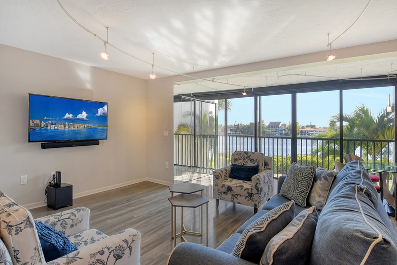 The open living space is bathed in sunlight from large sliding doors that showcase stunning views of the intercoastal waterway. The screened-in area allows you to listen to the gentle rustle of palm trees and enjoy the refreshing breeze from the comfort of the dining table and the plush seating area with a smart TV. The kitchen has an array of appliances, granite countertops, and a coffee bar featuring an auto-drip coffee maker for your morning brew. Each room is designed with your comfort in mind, offering soft bedding, a spacious closet, and a TV. You’ll enjoy a restful night in the primary bedroom, while the secondary bedroom provides two cozy twin beds that can be pushed together for a king size bed. The main bath includes a shower and tub combo, and there's an additional half bath for your convenience. Plus, a washer and dryer are available to make your stay even more enjoyable.